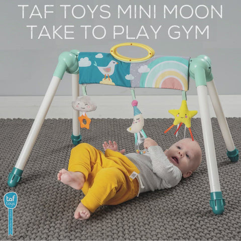 Taf Toys’ brand new Mini Moon Take to Play Gym is a sturdy and portable gym, with foldable legs and a carry handle for easy storage and travel. This lovely gym features three fascinating, detachable hanging toys, including a lovable jingle bell star with colourful ribbons, a mini moon ring rattle with colourful beads and a cheerful cloud rattle with fluffy fabric and a teether. The panel on the top of the gym is double-sided, with high-contrast imagery to offer visual stimulation to younger babies and a richly coloured side to captivate babies’ developing vision. The gym can be used with baby laying flat on the floor, while enjoying tummy time or even while sat in a bouncer. The portable nature of the gym ensures it’s perfect to take to friends and families houses, baby classes and more.